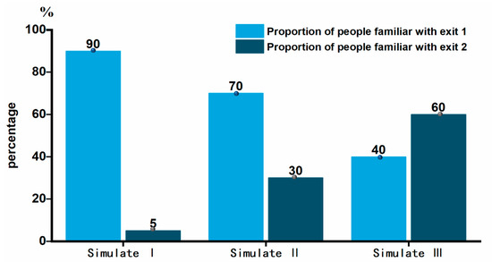 In simulation I, which represented the original circumstance, the crowd only received the basic drill education roughly and probably know the primary exit location and had not undergone drill training. For this circumstance, 90% of the individuals were set to be more familiar with Exit 1, only 5% of the individuals were set to be familiar with Exit 2. For the second circumstance, 70% of the individuals were set to be more familiar with Exit 1, and 30% of the individuals were set to be familiar with Exit 2, and this ratio setting was decided by the total number and time of drills they received. The third circumstance considered more people choose to take Exit 2 because they had received sufficient drill training. The proportion of evacuation from Exit 1 and Exit 2 was set to 40% and 60%, respectively. The familiar ratio of the grouped simulation was shown in Figure 9.