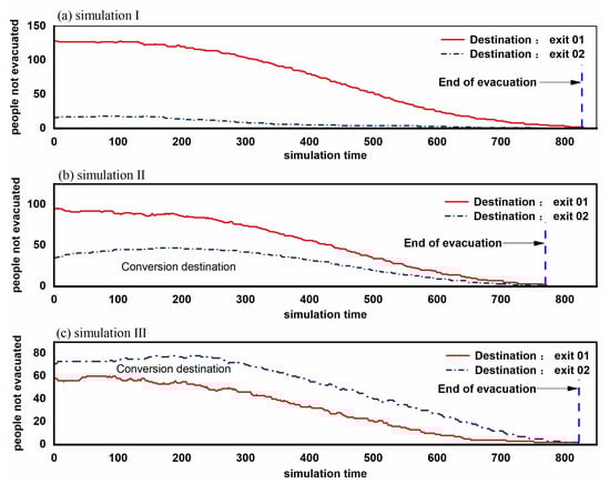 The total simulation results were shown in Figure 10, where we could see the number of people not evacuated versus the time. In simulation I, the total evacuation time was 813 steps, which shows no significant difference from the third circumstance. In contrast, the second circumstance consumed about 760 steps and declined by about 7% in time, showing the highest evacuation efficiency.