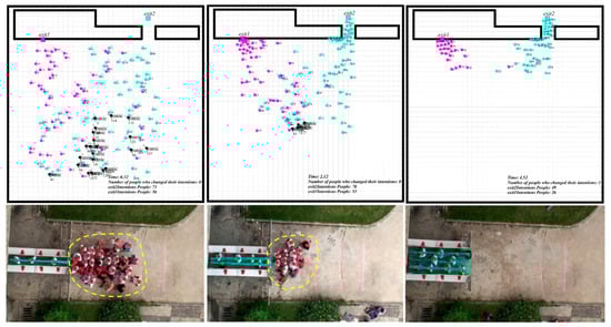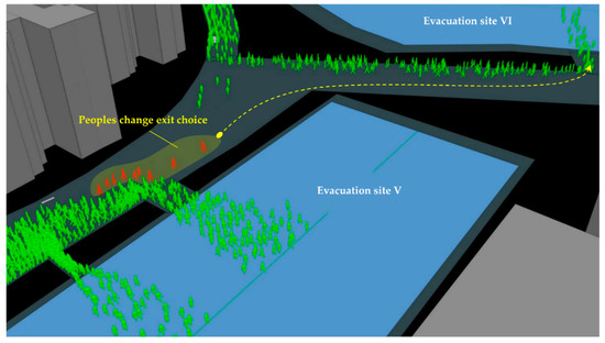 The dynamic interaction of people concerning the exits’ congestion state may influence the process of the evacuation. Due to the long distance of the target and the unclear vision, some pedestrians were hesitant about the evacuation direction during the evacuation process. This phenomenon will significantly shorten the overall evacuation speed and lead to exit congestion. We could observe the decision-making process in front of the congested exit in Figure 20. Agents marked in red who are familiar with the exit but cannot see the exit firstly went to exit VI and then chose exit V. This is because the evacuees’ primary exit selection criterion was the expected travel time, which depends on the distance from the current location to the exit. When encountering severe congestion in front of the familiar exit, the criterion changed to the sum of travel time and queue time. Simultaneously, according to the improved continuum model, people who are neither familiar with the exit nor can they see the exit will cause panic and make unreasonable judgments and behaviors. Panic behavior disrupted the balance of exit utilization and generated an unbalanced population distribution at each exit, leading to congestion and reduce evacuation efficiency. As seen from Figure 20, the red agent changes its original planned exit and chooses exit V, which is farther away. Therefore, the red-marked agent’s panic behavior will make the VI exit more crowded, while exit V is not fully utilized. The dynamic process similar to the red-marked agent may affect the entire evacuation process, explaining the congestion phenomenon appears again in front of the exit VI in case 04, shown in Figure 21.