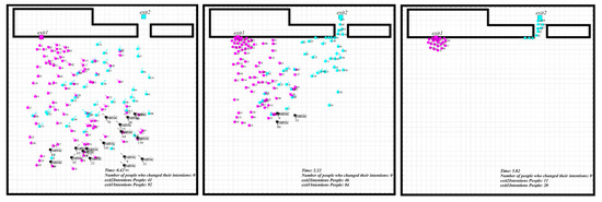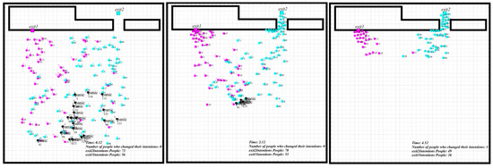 The third circumstance increased people’s familiarity ratio with Exit 2 based on the second circumstance. The total evacuation time showed no significant change than the first circumstance, while the evacuation process was quite different. For simulation 3, part of the individuals was indecisive for the evacuating direction during the evacuation. One of the reasons was that Exit 2 was relatively hidden, and it was not visible to many people. Although more people were familiar with Exit 2 than simulation 2, they could not assess the time spent in line because the exit was not visible. They were trapped by the hard choice of long-distance, high congestion level, and less familiar exit, and this kind of hesitation could significantly reduce the whole evacuation speed. We also found the lower evacuation efficiency caused by the imbalanced congestion and indecision from the comparison of Figure 12 and Figure 13 at the same time.