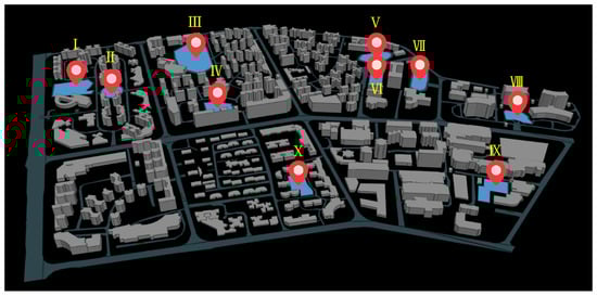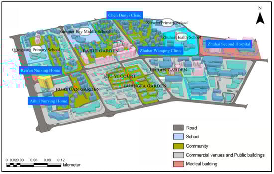 Huaping Community and its surrounding areas are located in Gongbei Street, Xiangzhou District, Zhuhai City, Guangdong Province. It is enclosed by Gangchang Road, Xiawan Road, Guihua South Road, and Qiaoguang Road, covering an area of 917,670 square meters and has a total of 288 buildings and a population of 19,948. There are eight residential communities, three elementary and secondary schools, one technical secondary school, two kindergartens, five medical institutions, and more than two large-scale living quarters. We selected this area as the research object (see Figure 15), considering a complete transportation network, different living facilities, and reasonable regional planning.