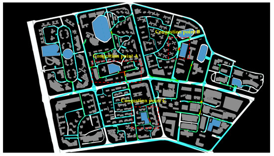 The parameters were set as following: the radius of each pedestrian, = 0.3 m, the average pedestrian’s desired velocity was set to a normal distribution with a mean of 1.35 m/s. Two hundred eighty-eight agent generators (from building exits) and ten agent collectors (shelters) were established in the simulated scenario. The evacuation routes of the pedestrians in the early stage were put into the emergency evacuation visual environment.