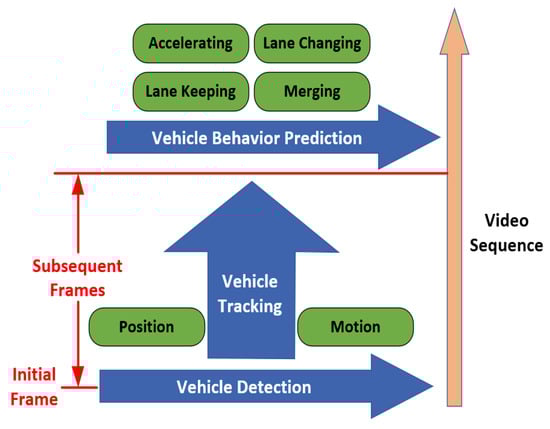 The complete framework of vehicle recognition in UGVs autonomous driving system is portrayed in Figure 2. Generally, vehicle detection is used to extract vehicle targets in a single frame of an image, vehicle tracking aims to reidentify positions of the vehicles in subsequent frames, vehicle behavior prediction refers to characterizing vehicles’ behavior basing on detection and tracking in order to make a better decision for ego vehicle [14]. For tracking technology, readers can refer to [15,16], while for vehicle behavior prediction, [17] presented a brief review on deep-learning-based methods. This review paper focuses on the vehicle detection component among the complete vehicle recognition process, summarizes and discusses related research on vehicle detection technology with sensors as the main line.