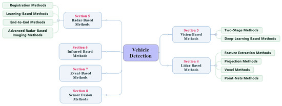 This article is organized as followed. Section 2 introduces the commonly used sensors on UGVs and compares the pros and cons of different sensors under different application scenarios. Section 3, Section 4, Section 5, Section 6, Section 7 and Section 8 systematically summarizes and compares the research works related to vehicle detection using different sensors, the structure of the vehicle detection overview is illustrated in Figure 3. Section 9 introduces the simulation platform related to UGVs, which is convenient for simulation tests of the vehicle detection algorithm. Section 10 introduces the datasets to verify the actual effect of the vehicle detection algorithm. Section 11 summarizes and looks forward to the research focus and direction of vehicle detection technology.