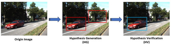 Vision-based two-stage vehicle detection method usually follows two steps: hypothetical generation (HG) and hypothetical verification (HV). The purpose of the HG step is to generate a candidate region that may contain vehicles in the captured image, represents the region of interests (ROIs), while the HV step aims to identify the presence of a vehicle in ROIs. The detection process of two-stage methods is described in Figure 4.