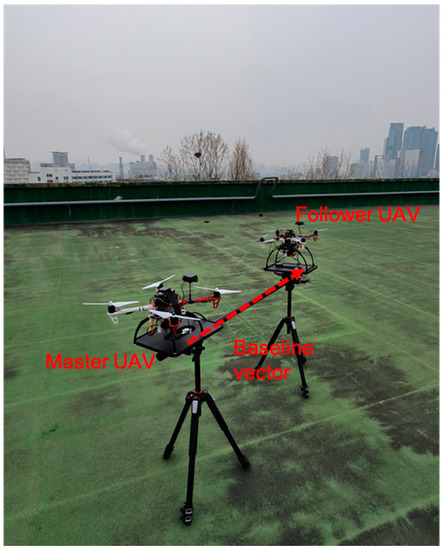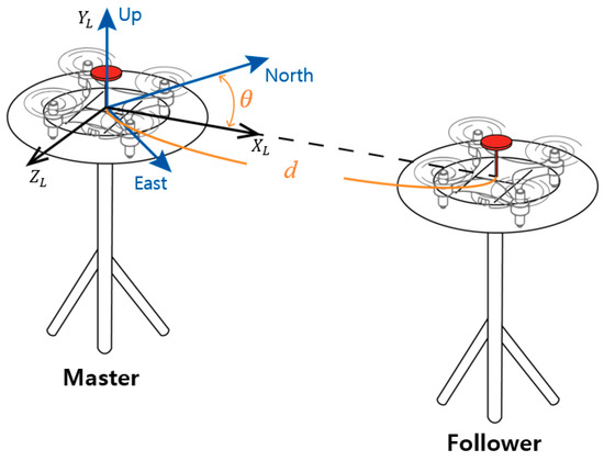 The proposed launchpad geometry. Two unmanned aerial vehicles (UAVs) are placed on the leveled pad discs and their heading directions are aligned with the baseline. The Master UAV is located at the origin of the local East-North-Up (ENU) coordinate system, while the Follower UAV is placed at .