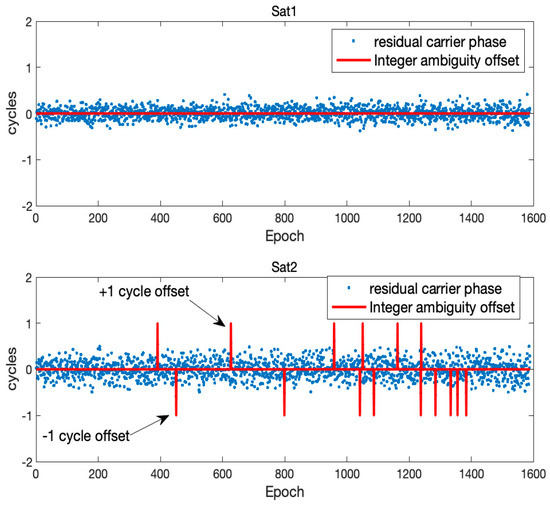 Figure 2 shows two examples, satellite 1 (Sat1) and satellite 2 (Sat2), of residual double difference carrier phase measurements in cycles subtracted from the correct integer ambiguities. The examples were generated using the SatNav simulator [33] with d as 2 m, and and were assumed to follow a zero-mean Gaussian distribution with standard deviations of 1 cm. was assumed to follow a zero-mean Gaussian distribution with 1.0 degrees standard deviations. In Figure 2, the red line indicates the integer ambiguity offsets resulted from using Equation (6) with measurements at one epoch only. The standard deviations of the carrier phase residuals of Sat1 and Sat2 are 0.12 cycles and 0.19 cycles, and there are many cases of one cycle integer ambiguity offsets in Sat2.