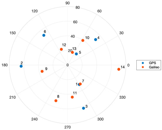 A sky plot of the simulated Global Positioning System (GPS)/Galileo constellation with respect to the user’s location. The dots represent a satellite and the numbers beside the dots indicate satellite numbers. The satellite constellation was generated using the SatNav simulator.