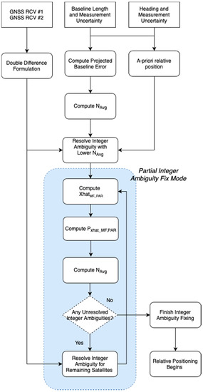 where is the number of averaging epochs computed using and Equation (15). As is small, in the partial integer ambiguity fix mode becomes small as well. The immediate consequence is that the remaining integer ambiguities can now be fixed with much lower averaging epochs. Figure 6 shows the overall procedure of the proposed integer ambiguity fix strategies, including the partial integer ambiguity fix mode.