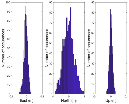 The figure shows the error distribution of the follower relative position, , in ENU coordinates determined by the partially resolved integer ambiguities in 1000 simulation cases. The partial integer ambiguities were resolved at 16th epoch. was computed by averaging the position solutions with the carrier phase measurements during 16 epochs and the partially resolved integer ambiguities.