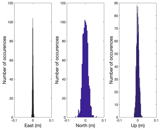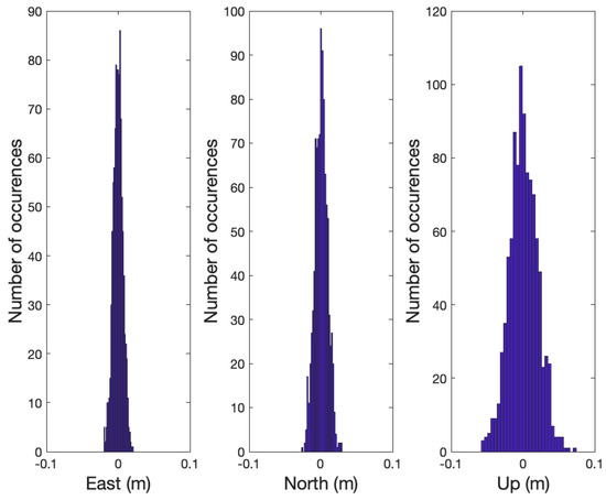 As the required averaging number of epochs, , is computed based on the double difference line-of-sight vectors and the covariance of , the for all satellites remained constant as shown in Table 2 in the simulation. Therefore, the partial integer ambiguities of Sat 1, 3, 4, 7, 10, and 13 were fixed at the 16th epoch, and was computed with those satellites. Figure 8 shows the distribution of the averaged positioning errors in . is averaged to reduce the multipath and noise effects assuming that the two GNSS receivers did not move. With and , for the remaining satellites was less than ; therefore, the integer ambiguities of the remaining satellites could be immediately resolved. As a result, the required averaging epochs for all satellites was effectively , and no wrong integer fixes occurred in all 1000 cases. Figure 9 shows the distribution of the positioning errors using all satellites.