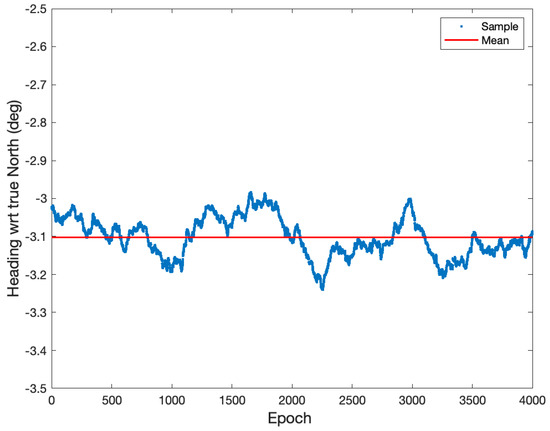 Heading measurements of the baseline shown in Figure 10. The measurements were obtained from a ST Micro LSM3030D magnetometer at a rate of 10 Hz. The mean value of the measurement data was −3.1 °, and the standard deviation was 0.05 °