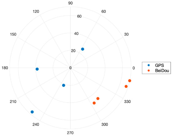 Sky plot of the GPS and BeiDou satellites taken at at Hongik University on 22 December 2020. There were a total of eight GPS and BeiDou satellites in view, which represents a GNSS harsh environment.