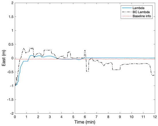 Comparison of the relative positioning error in the East using Least-squares Ambiguity Decorrelation Adjustment (LAMBDA), Baseline Constrained (BC) LAMBDA, and the proposed method using baseline information.