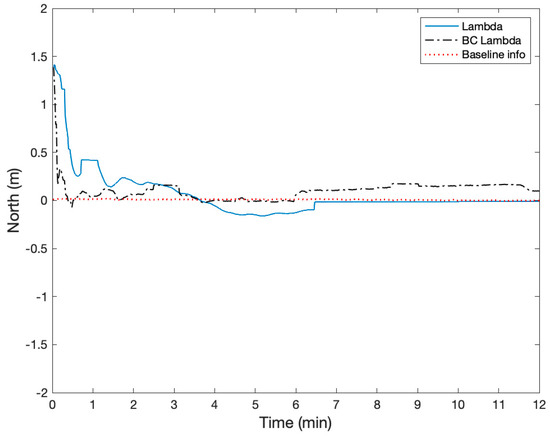 Comparison of the relative positioning error in the North using LAMBDA, Baseline Constrained (BC) LAMBDA, and the proposed method using baseline information.