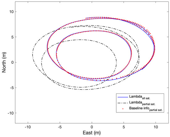 With the proposed method, all of the integer ambiguities were resolved after 16 s in the test. Figure 16 shows the trajectories of the rover receiver from using LAMBDA with all satellites in view, LAMBDA with a partial satellite view, and the proposed method with a partial satellite view. While the trajectory of LAMBDA with all satellites in view and the proposed method with a partial satellite in view well matched, LAMBDA with the partial satellite view never reached a fixed solution and deviated from the other two solutions. Compared with LAMBDA with all satellites in view, the positioning errors of the proposed method with the partial satellites in view were 4.07, 11.03, and 13.12 cm, respectively. The slightly larger error of the dynamic test compared with the static test appeared to be caused by a small time delay in RTKLIB solutions.