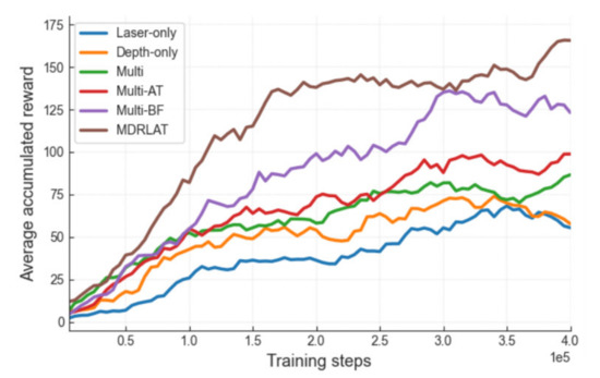 Smoothed training curves of average accumulated rewards obtained by each method at different training steps. Laser-only, directly feed the feature representation extracted from two-dimensional (2D) laser range findings into dueling double deep Q-network (D3QN); depth-only, directly feed the feature representation extracted from depth images into D3QN; multi, directly concatenate the feature representations extracted from different sensor modalities; multi-AT, adopt the auxiliary task module in the multi method; multi-BF, adopt bilinear fusion (BF) module in the multi method; MDRLAT, our proposed method.
