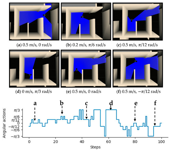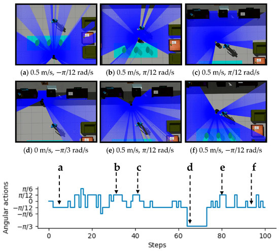 To intuitively illustrate the performance of the proposed method, two examples of control commands produced by MDRLAT in different scenarios are shown in Figure 6 and Figure 7. For the convenience of description, the top view of six intermediate time steps is presented and the sub-caption indicates the corresponding linear and angular velocity commands in each example. Meanwhile, angular velocity commands in all time steps are provided at the bottom. As shown in Figure 6, in the beginning, the robot executes a large linear velocity command to pass through the door. Subsequently, the robot turns left to prevent from bumping into the wall and enters the narrow room. Later on, a zero linear velocity and a large angular velocity are derived so that robot can drive itself out of a dead end without any collision. Another example is shown in Figure 7, after passing through the table, the robot is controlled to make a left turn to avoid collision with the person. Subsequently, the robot moves forward rapidly and then changes its orientation to avoid the desk and office box. Taken together, these examples demonstrate the ability of our proposed method to deal with dead ends and different kinds of obstacles in virtual testing environments.