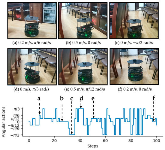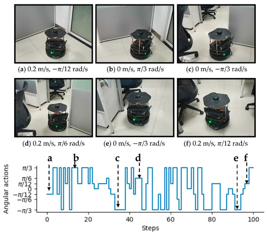 In this section, a variety of experiments were implemented in real-world scenarios to further assess the performance of the proposed MDRLAT. As shown in Figure 10, we used an NVIDIA Jetson TX2 as computing platform and an open source hardware platform turtlebot2 [37] equipped with a RPLIDAR 2D laser range finder and a Microsoft Kinect v1 camera for experiments. The control commands determined by MDRLAT were transmitted to the robot through ROS messages. Firstly, we tested our proposed method in an office environment, the third-person view of intermediate time steps is presented in Figure 11 and the sub-caption indicates the corresponding linear and angular velocity commands. In the beginning, the robot was running into a dead end and then it changed direction to the left to prevent from bumping into the office cubicle. Subsequently, when a previously unseen obstacle (office chair) was detected, a large angular velocity was selected for the robot to turn right to avoid collision. Then, the robot executed a small angular velocity to adjust its orientation so that it can pass through between office chair and office cubicle without any collision. After that, the robot moved forward with a small linear velocity in the constrained space and then made a right turn with a large angular velocity to avoid another office chair. This suggests that by following the control commands determined by MDRLAT, the robot can move safely in cluttered office environment with objects absent in the training environment.
