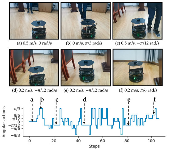 In addition, our MDRLAT was evaluated in a meeting room as well. As depicted in Figure 12, in the beginning, the robot executed a small angular velocity and turned left to prevent from bumping into the cabinet. Subsequently, the robot travelled forward with maximum linear velocity until a right turn was needed to avoid colliding with chairs on the left. Later on, a left turn command was derived to adjust the orientation of the robot so that it could move safely in the narrow space between two rows of chairs. Finally, an example of dealing with dynamic obstacle is illustrated in Figure 13. It can be observed that the robot moved forward with the maximum linear velocity and a zero angular velocity when the pedestrian was far away. However, as the pedestrian kept moving ahead, the robot received a large angular velocity command and turns left rapidly to avoid the pedestrian. After that, the robot continued to travel forward with the maximum linear velocity and then turned right to avoid chairs. Later on, a decreased linear velocity was derived to control the robot to pass through between chairs and lecture table safely. Taken together, these experiments validate the outstanding performance of the proposed MDRLAT, which can enable a mobile robot to avoid various obstacles in different complicated real-world environments.