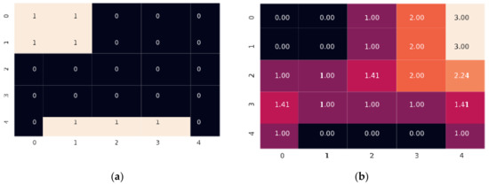 In order to improve the performance of the architecture, we use the distance transform watershed to pre-segment the maps. A distance transform represents the distance of each accessible (white) pixel to the closest border pixel (black). In below, Figure 1a shows a binary map matrix, and in Figure 1b shows the corresponding distance transform matrix.