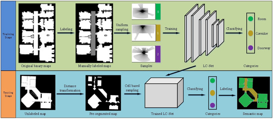 In the test stage, the unlabelled binary map is pre-segmented into many closed simple areas firstly. Then we sample the lidar line data uniformly in each distance transformed pre-segmented area. We use the data sampled in the distance transformed pre-segmented area, which gives a greater distance between classes in rooms, corridors and doorways. Next, the optimized areas based sampling data are inputted into the trained LCNet for classification. Finally, the semantic information in each cell are obtained according to the proposed “winner-take-all” principle. The overall framework of our method is illustrated in Figure 3.