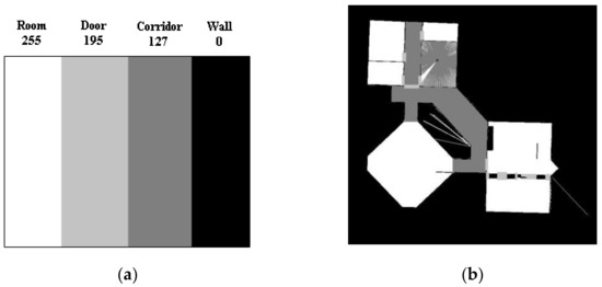 (a) shows the four labels and its grayscale values: 255 for rooms, 195 for doorways, 127 for corridors, and 0 for walls, (b) shows the simulated laser scanner measurement within the manually labelled map.