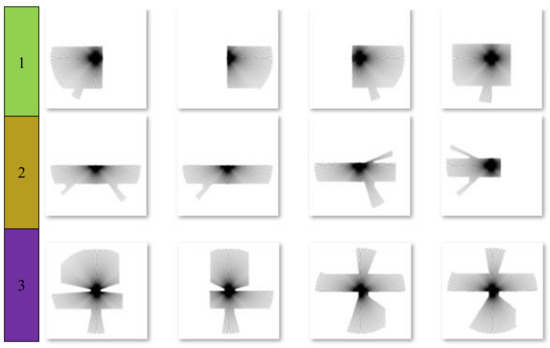Our simulated robot is equipped with a 360° field of view laser sensor. Each laser observation consists of 360 beams. With the robot traveling to all the areas where the grayscale values of labels are bigger than zero, as shown in Figure 4b, the laser map information and labels in every point are uniform sampled as the training data. As shown in Figure 5, the laser map information collected from different kinds of areas reflect various kinds of appearance information. The beams of corridors are usually long and narrow, while those of rooms are wide and round. With access to ample data, we can train a powerful classifier based on a neural network.