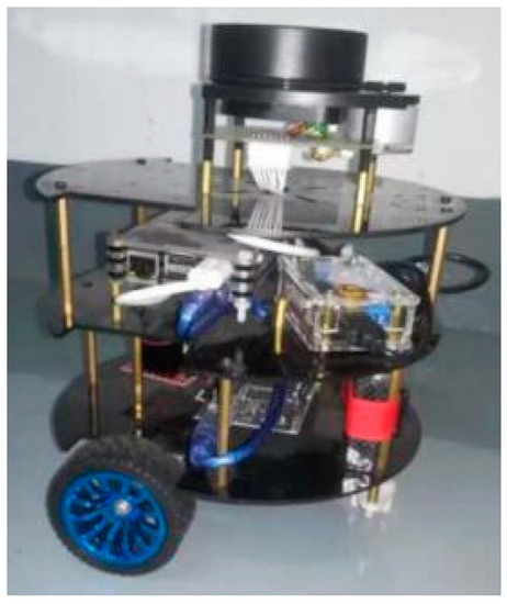 The proposed method has been tested on real robots as well as in simulation. The robot used to carry out the experiments is a mobile robot equipped with a 2D laser (RPLIDAR-A1, SLAMTEC, Shanghai, China), which can perform 360° scans within 12-m range and generate 8000 pulses per second. This system supports programming with Raspberry PI and the Arduino toolkit, as shown in Figure 8. With its compact structure, the robot can move through the room flexibly, and with the adoption of Gmapping package in a ROS framework, it can complete the SLAM task reliably.
