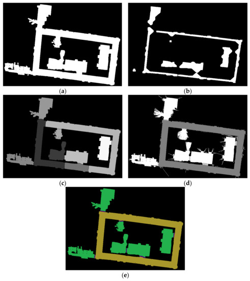 (a) is the binary pre-processed map (PPM), (b) is the result of distance transformation, (c) is the pre-segmented map (PSM)processed by distance transformation and watershed algorithm, (d) is the map with room and corridor labels, and (e) is the result of Semantic Segmented map.