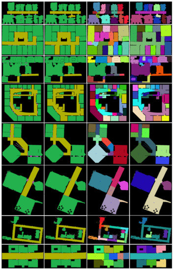 In order to verify the performance of the proposed method, we used six maps of the public data set in [3] and two maps collected in our laboratory for comparison. The resolution of each map is 0.05 m/grid. The true area size of the maps ranges from 100 m2 to 1000 m2. Based on the above data, we used a unified hardware platform consisting of an Intel i7 8700 h CPU and an NVIDIA 1070ti GPU with 32 G RAM to compare the operation effect of the proposed algorithm with the Voronoi algorithm and the morphological segmentation method. The experimental results are shown in Figure 14, where the first column depicts the ground truth room segmentation from human labeling, the second column shows the proposed method’s segmentation, the third column depicts the Voronoi graph-based segmentation, and column 4 is the morphological-based segmentation. The average statistical results are shown in Table 5. The parameters in this table are explained as follows: Recall: the recall rate of the algorithm. Precision: the accuracy rate of the algorithm. Average Runtime [s]: the average running time of each map. Segment area: the average area of the obtained segments in m2. The evaluation method is expressed as follows: