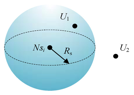 where, V(Nsi, Nsj) is the volume of the overlapping area covered by two nodes. Then, the probability that Nsi is not covered by neighbor node Nsj is expressed as Equation (6):