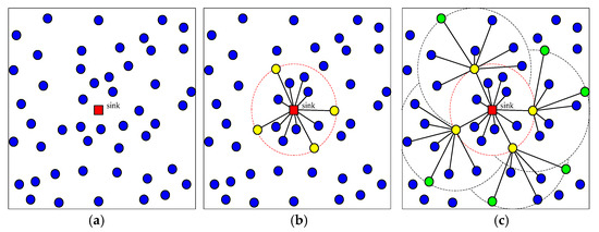 Figure 4 shows an illustration of this deployment strategy. The sensor nodes are dropped randomly to the water surface of the monitoring area initially as shown in Figure 4a, where the red node denotes the sink node. The connected tree which is rooted with sink node in the first phase of the strategy is shown in Figure 4b, where the yellow nodes denote Root1, i.e., the 1st GR. The 2nd NGRs and the connected trees which are rooted with the corresponding the nodes in Root1 are shown in Figure 4c, where the green nodes denote Root2, i.e., the 2nd GR.
