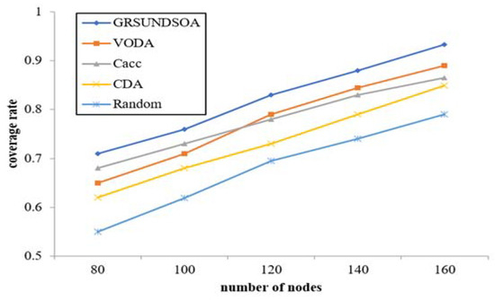 - A novel depth-adjustment self-deployment algorithm based on growth ring style is proposed. This algorithm strives to obtain the optimal network coverage rate on the basis of ensuring energy consumption balance and connectivity. Different from the recent approaches in the literature such as CDA [26,27], Cacc [28], VODA [29], and DODA [30], the proposed algorithm searches the global optimal dive position based on the basic nodes for depth calculation rather than the local optimal dive position. Furthermore, the proposed depth calculation method is with the goal of comprehensive optimization of both maximizing coverage utilization and energy balance, rather than just coverage only. Therefore, the coverage rate and energy balance of UWSN deployed by GRSUNDSOA is improved greatly.
