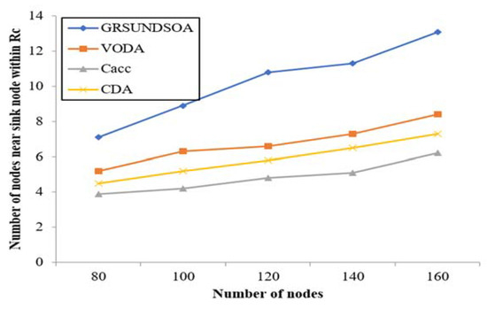 Let the numbers of nodes within Rcmax from the sink node be denoted as Nsin. Let the average number of neighbor nodes for all sensors be denoted as Navg. Nsin and Navg are calculated as Equation (9) and Equation (10), respectively: