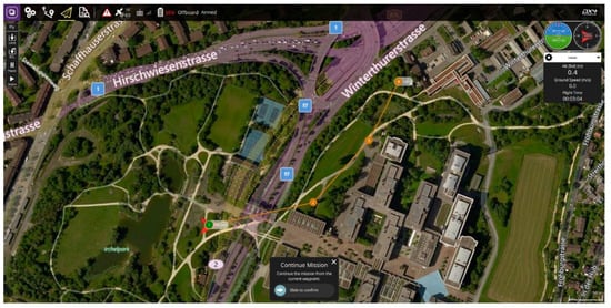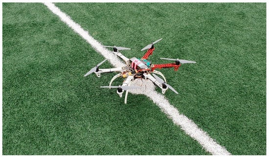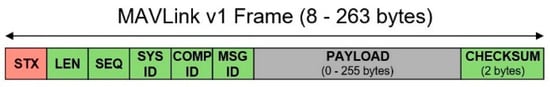 UAS is a generic term used to denote the combination of a drone and a ground control station (GCS), as well as the communication system between the two. A drone refers to an aircraft that flies automatically or in semiautomatic mode without a real pilot on board. It performs its missions by controlling its altitude and position through an internal flight controller. The flight mission is performed either by transmission from the GCS or by built-in algorithms. The conventional media used for communication are RC transmitters, Bluetooth, Wi-Fi, and radio. Drones can send and receive commands and status from the GCS through these media using the MAVLink message protocol []. MAVLink is a light messaging protocol for onboard communication or components of drones. It can be implemented in 14 languages, including C and C++; various high-level APIs exist for interaction between other systems such as drones and ROS. The protocol can also be used by at least seven GCS software programs (e.g., QGroundControl and Mission Planner) to communicate with the drone. Figure 1 shows the MAVLink protocol message. Figure 2 shows QGroundControl, an illustrative GCS in UAS configuration. Figure 3 shows the UAV used in this paper.
