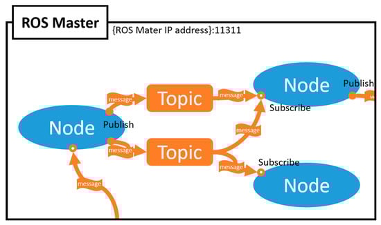 As mentioned earlier, ROS is the middleware for robot software development []. Unlike the operating systems used in computers, it provides services such as hardware abstraction, low-level device control, and message delivery between processes for system operation. For asynchronous communication in ROS, the publisher-subscriber model is adopted; the topic field is used for communication between the publisher and the subscriber. Figure 4 shows the structured model of ROS. The ROS consists of the master, publisher, and subscriber node. The master node connects the subscriber node to the publisher node that wants access to a specific topic. With the help of the master node, the connected publisher and subscriber nodes will be able to send and receive the desired data through the topic.