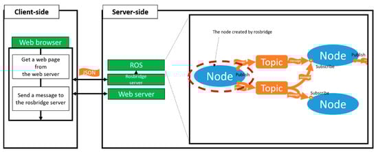 Rosbridge is a package of ROS that allows us to use topics and services in ROS even if the client does not have ROS installed. This is possible because the JSON-based rosbridge protocol is used on the server with ROS installed. When a rosbridge server that communicates with WebSocket on the ROS server side is executed, it is possible to communicate with the node of the ROS server through various front-end devices such as the web browser, and the service is also available. Figure 5 describes the concept of rosbridge [].