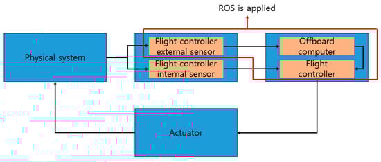 Advanced operations in UAVs require hardware and software capable of additional computing functions as well as flight controllers. The ability to provide additional assistance to the flight using information and computing power outside the flight controller is called offboard mode. The UAS assumed in this paper has a structure in which offboard computers are connected to the flight controller and communicate with each other. In addition, offboard computers support communication between flight controllers, external sensors, and offboard computers via ROS. Figure 6 schematizes the UAS with the aforementioned communication architecture from a CPS perspective. As with the CPS, this figure incorporates the plant, sensor, controller, and actuator to form a closed loop from data recognition, information exchange, decision making, to final execution. The red box indicates the part to which ROS is applied.