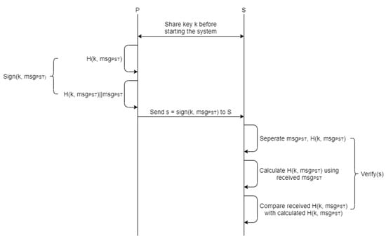 - P performs a signature on msgPST. Sign(k, msgPST), the signature procedure, means H(k, msgPST)||msgPST.
