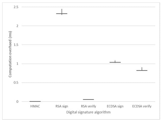 The computational overhead indicates how long it takes to perform an encryption. Figure 10 is the benchmarking result using the crypto++ library, with RSA-2048 taking 2.32 ms to sign and 0.05 ms to verify. ECDSA takes 1.03 ms to sign and 0.82 ms to verify.