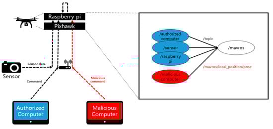 Figure 11 shows the UAS environment configured for experimentation. Pixhawk is an industry standard autopilot developed and jointly developed by 3DR Robotics and Ardupilot Group. Various robots such as RC cars, airplanes, and multicopters can be made, and firmware is provided for them using Pixhawk. We made quadcopters that belong to a class of multicopters, and we used them for the experiment. Pixhawk typically uses two firmware, i.e., Ardupilot and PX4. We used PX4 firmware that supports offboard mode in the experiment because we assumed UAS to operate advanced drones such as autonomous driving and cluster flight using offboard mode. Pixhawk uses the MAVLink protocol for communication. MAVLink is a light messaging protocol for onboard communication or components of drones. This can be implemented in 14 languages, including C and C++, and various high-level APIs exist for the interaction between other systems such as drones and ROS. The companion computer used Raspberry Pi, which is an embedded Linux-based development small computer, and Ubuntu MATE, which is a Linux-based OS, was used in the computer. In using ROS with Raspberry Pi, this setup has better compatibility on a variety of issues, such as packages and kernels. ROS stands for Robot Operating System, which is not similar to the conventional operating systems used in computers. It is a middleware concept for robot development that is installed on an OS such as Linux or Windows. We installed ROS Kinetic for the experiment. ROS supports node-to-node communication using XML-RPC and TCP. XML-RPC is an XML-based distributed system communication method that is simple and portable RPC protocol over HTTP. This is used in ROS by the publisher and the subscriber to communicate with the master node to connect with each other. When the publisher sends data for a particular topic after the connection, it serializes the data and sends the data to TCP payload. The subscriber receives the packet and receives the data by deserializing it. We use the MAVROS package, which is an ROS expansion package. This package enables MAVLink communication between Raspberry Pi and Pixhawk where ROS runs. Hence, the /mavros node, which receives data related to the flight from the publisher, forwards the data to Pixhawk through the MAVLink protocol. Upon receiving this, Pixhawk calculates flight control from the flight stack based on the corresponding data.