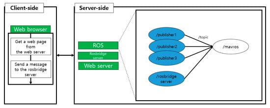 Rosbridge is a package that enables the synchronous and asynchronous communication of ROS in an environment where ROS is not installed. We implemented a web client that can use ROS using the roslibjs library for experiments. At this time, the server side should run rosbridge to create a node that sends data to the MAVROS. Figure 16 briefly describes the rosbridge used. For practical use of rosbridge, three applications must be run on the server side. The first is ROS, and the second is the rosbridge server. When the rosbridge server receives a message from the client regarding which topic to send, it attempts to connect with the subscriber receiving the topic. In Figure 16, the corresponding subscriber is /mavros. The third application is the web server. The web server provides roslibjs services to clients via web pages and helps them communicate indirectly with ROS through rosbridge. These three applications do not necessarily have to run on one computer, and they can also run on multiple server computers. This will allow the client without ROS to communicate with the ROS installed computers. This experiment can be found in [,].