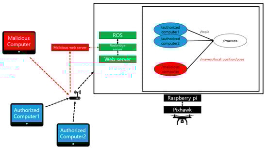 This section describes the modes of attacks in native ROS and the ways that can be used to defend the native ROS through the proposed framework. The attacks in the environment are shown in Figure 12. First, the accredited device sends the data and commands necessary for the flight to /mavros via a specific topic. The drone performs normal flights based on their data. At this time, a malicious computer breaks into the network with the aim of sabotaging the system and then register the publisher with the ROS that transmits the /mavros/local_position/pose topic. An attacker could then influence the flight path of the drone by means of the corresponding topic. This experiment can be found in [,].
