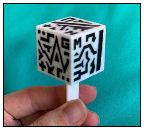 - Clinic mode displays the virtual 3D models in their corresponding position with respect to the surgical guide, which is registered to the cubic marker (Figure 4b). This mode is designed to be used with the surgical guide fixed on a 3D printed bone (or fragment), allowing for surgical planning and training.