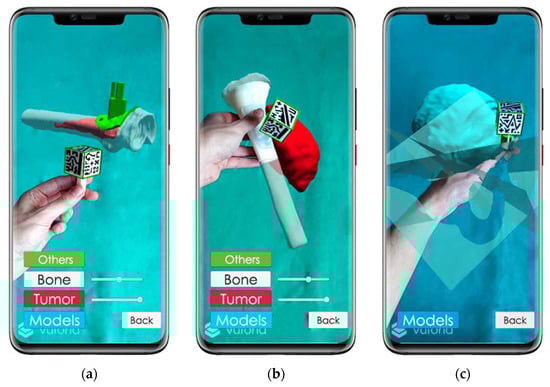 - In the Demo mode, all the virtual 3D models are displayed around the AR marker, without any patient registration (Figure 4a). The AR marker can be rotated to show the virtual models from any point of view.