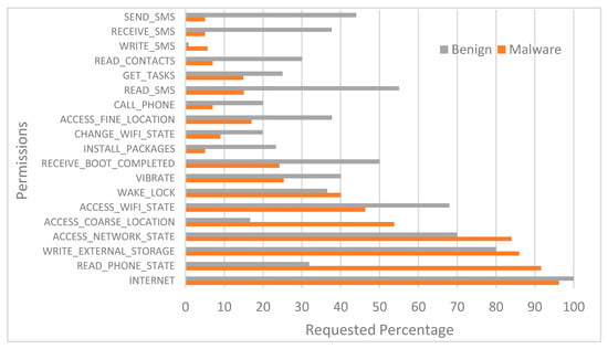 As noted earlier, each app requests a set of permissions necessary for it to operate. In this section, we analyse the distribution of the requested permissions in each app. For each permission requested by the apps, we obtained the percentage of the permissions usage in each class (i.e., benign and malware). Figure 3 shows the most frequently requested permissions by the samples in our dataset. The pattern of the permission requested by the apps is basically similar to the recent studies [,]. Although we can observe from the figure that few of the permissions (e.g., INTERNET and READ_PHONE_STATE) are the most widely requested permissions in the dataset by both benign and malware samples, prior research confirms that benign and malware apps requesting a similar set of permissions is very common.