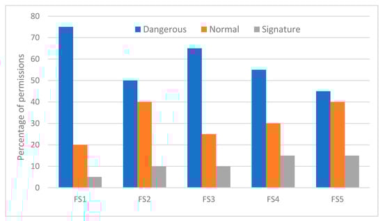 In order to determine the similarity between the feature subset selection approaches from the feature ranking point of view, we analyzed the methods by considering the top feature subsets recommended by the methods. Figure 4 shows the distributions of the top twenty features with respect to the permission protection levels (i.e., normal, dangerous or signature) for all feature selection methods. The top features selected from the dangerous permission level by the selection methods are in the range of 75% to 45% while between 15% to 5% of the top features are from the signature/system protection level class. FS1 selects 75% of the top features from the dangerous protection level class whereas FS5 selects 45% of the top features from the dangerous protection level class. Permissions selected by the FS3 method consists of 60% dangerous, 30% normal, and 10% signature levels.