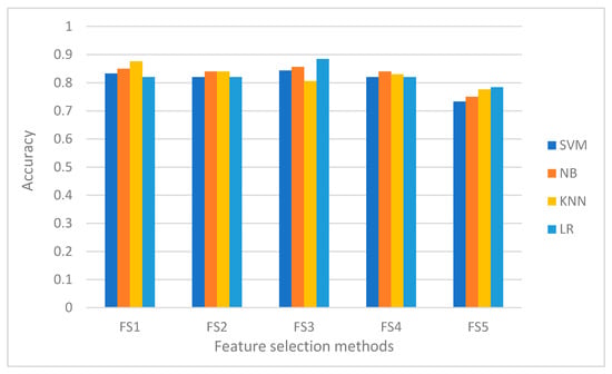 We now consider the predictive performance of the feature subsets recommended by the feature subset selection methods discussed in Section 4. We used the feature subsets with five machine learning models. Figure 7 shows the performance of the feature subsets under five different classifiers. From the results of the experiment, it is not possible to pinpoint a single feature subset selection method as winner. This is because none of the methods is always the best since there are many factors that influence the performance of the methods, which include the data sets used, the classifiers and the presence or exclusion of one or more relevant features. As can be observed from the result, feature subsets produced by a single method can lead to learning models with quite different predictive accuracy. For example, KNN performs better than SVM with FS1 while SVM performs better than KNN with FS3.
