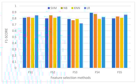 F1-score of the five classifiers under the feature subsets produced by the feature subset selections.